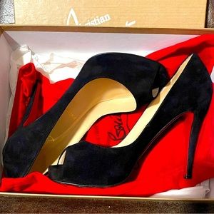 Presenting “Christian Louboutin” Very Prive peep toe platform pump. EU38.5. Ultra plush Veau Velour suede leather, very supple, conforms to your feet like a glove. 1/2 inch hidden platform wrapped in Veau Velour, My favorite go to for anything pumps. Hardly ever wore them, you can see they are impeccable. I only wore them indoors on hard wood and or carpet. Oh! not to mention, these even have the glossy Casali Italy sole protectors for added protection. “Just can’t go wrong pumps”. Original retail $895. Plus $125 for the soles at Nordstrom. 120mm but feels like 100mm since it has a platform.