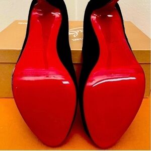 Presenting “Christian Louboutin” Very Prive peep toe platform pump. Ultra plush Veau Velour suede leather, very supple, conforms to your feet like a glove. 1/2 inch hidden platform wrapped in Veau Velour, My favorite go to for anything pumps. Hardly ever wore them, you can see they are impeccable. I only wore them indoors on hard wood and or carpet. Oh! not to mention, these even have the glossy Casali Italy sole protectors for added protection. “Just can’t go wrong pumps”. Original retail $895. Plus $125 for the soles at Nordstrom. 120mm but feels like 100mm since it has a platform.