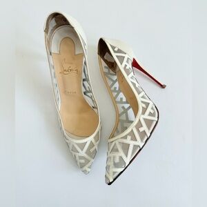 These stunning pumps are crafted of stunning see through geometric pattern. These have a pointed toe and a 4.5 inch heel. These are excellent pumps to make an impression with the iconic style of Christian Louboutin.