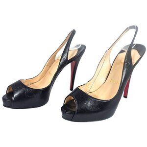 These EUC Christian Louboutin slingback heels feature an elegant peep toe design that complements formal outfits. The classic black leather with signature red soles offers a stylish and sophisticated look, suitable for various occasions. The high stiletto heel adds a touch of glamour, making them a chic choice for evening events.