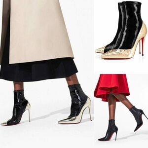 In wonderful like new condition size 38. No signs of wear on outer booties. Only signs of wear on bottom soles. Comes with dust bag. Will include a box not the original box. Perfect for any special occasion such as a date or a holiday party. Metallic gold with Pat and black leather. 100mm heel height