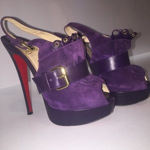 guaranteed authentic! Dust bag, heel taps and original box included! Purple suede and leather w/ gold hardware buckle!