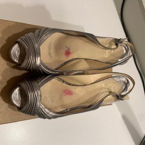 beautiful - authentic Christian Louboutin peep toe heel in metallic leather - slight ware on heel and toe (see pictures) otherwise in good condition. Gorgeous and timeless shoe! Size 36.5 / 6.5 US