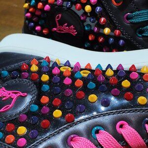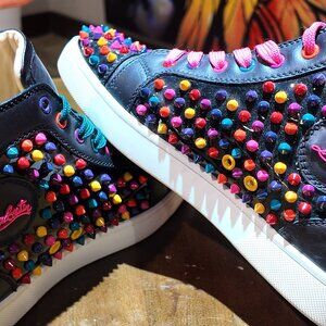 This is a pair of Christian Louboutin spikes. I had to go ahead and drop some heat since I'm a new page and see if I can get some onlookers lol. I know I know, ARE THEY REAL?!?! Yes, my friend, they are most definitely the real deal. They are size 40.5 which fits size US9 in men's. Black leather with patent leather on the toe and multicolor spikes all over. I may even have the little bag of extra spikes that came with the shoes, although no spike ever fell out of these in any place. However, I no longer have the box and tags and all that...I wore them lol. Like I said, I don't dog my shoes. I take care of all of my stuff. The attention you get in these when you're out and about is crazy! People can't stop looking! I call em Fruity Pebbles lol. I would wear them with anything, and they pop every time! I wiped them off a little for the pictures but being as though I'd like to sell them, I didn't want to try cleaning them too much to avoid any marks or just anything on my end. Again, they've been put up, hence the dust lol. These are a serious buy. Send me a message and we can chat about them :) When these dropped around 2015, they were $1,650 US. *sidenote