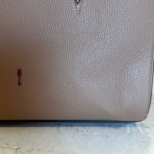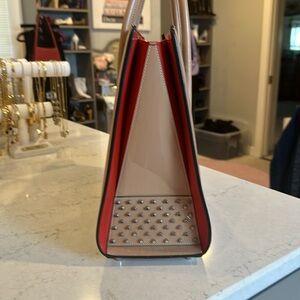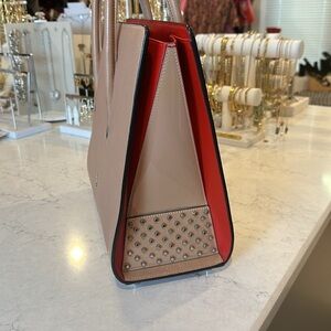 In like new excellent condition. No rips or rubbing to leather/piping. Small areas creased. Made of pebbled leather and tan patent leather on sides. Studs adorn both sides and accented with red leather. Clean red leather interior with one zipper pocket. Tan leather strip slips into slot for purse closure. 4 silver tone feet on bottom. Shiny silver tone hardware free of scratches. Comes with two tone strap for crossbody use. Expands to allow for maximal storage of personal items like an iPad. See all photos for they are a part of its description and condition of the bag. Stunning rare find and stand out from the crowd with this gorgeous bag that few possess.
