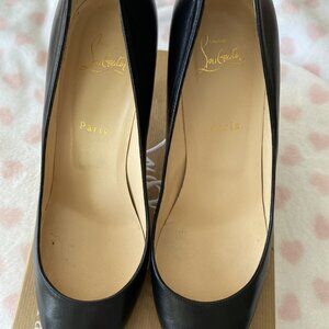 Christian Louboutin size 40.5 women's black pumps red bottom with box, felts and extra heel tips. Please note that on one heel at the bottom there’s bunched up leather from getting caught on a sidewalk. See picture.
