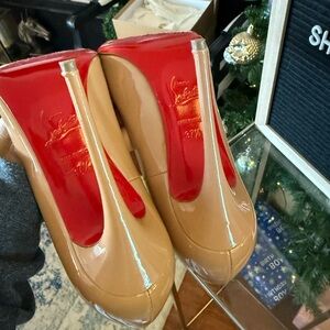 Chic blush patent leather heels. Signature red sole. Elegant and timeless design.
