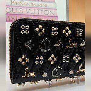 Chic black wallet with striking gold embellishments. Signature Louboutin style.
