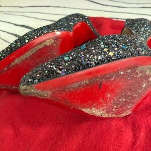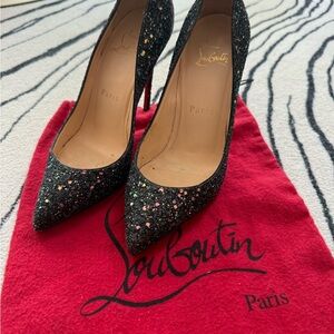 Very much loved shoes, Bought in original Louboitine store in Switzerland, was wearing for events and Dinner parties. My feet had grown for some reason and than shoes no longer fit me… so I’m selling it and will get similar pairs to have in wardrobe. Great shoe, I haven’t changed the bottoms to make it look newer as I’m ok with them as is, they look fine ones you have then on with outfits. Classy, beautiful.