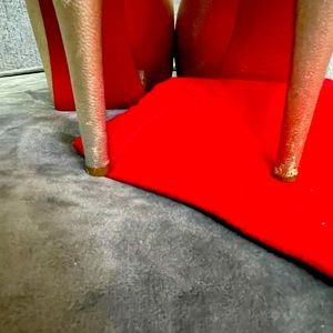 Shimmering gold loved red bottoms, these are 💯 percent authentic will come with bag after having a baby my foot got bigger so these no longer fit, some have been redone and leather has been reconditioned, regularly clean by shoe cobbler.