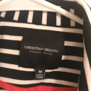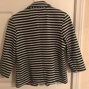 Black and white striped, three quarter sleeve. Never worn. Zipper pockets in front. Fabric is structured with little stretch.