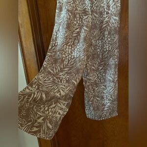 Wide leg pants with a striking brown and white pattern. Ideal for casual wear.