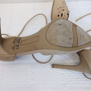 Christian Siriano for Payless lace-up, pointed toe heels. Faux suede with lazer cut details. Size 6.5, 4" heel. Taupe. EUC, see photos for details.