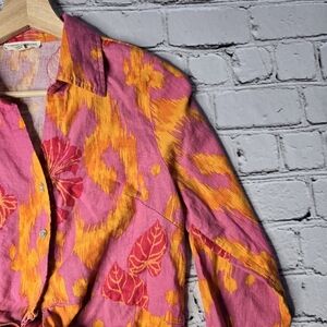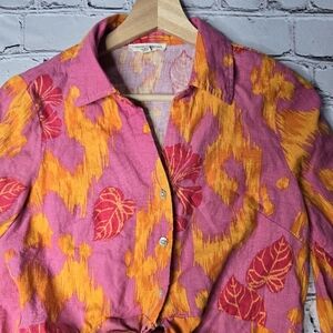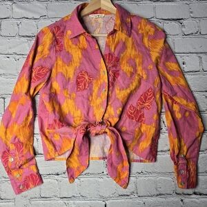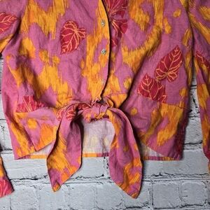 Christian Siriano Linen Blend Orange Pink Button Up Tie Front Blouse Size M