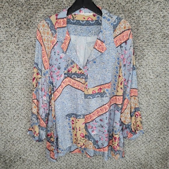 Christian Siriano Top Womens Plus 1X Blue Floral Print Collared Button Up Casual