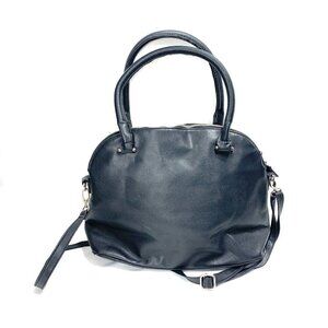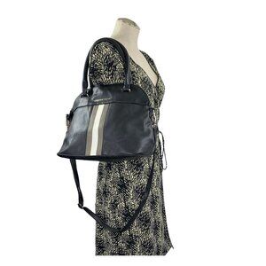 Cute striped dome style satchel by Christian Siriano in black vegan leather with tan & white stripe detail. Two rolled handles and a removable crossbody strap. Striped fabric lining with 1 zip and 2 slip pockets. This bag shows some wear, please read on for more details. Priced accordingly.