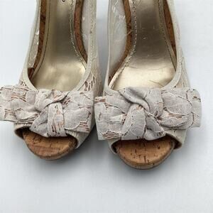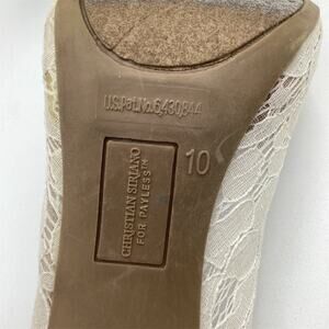 Keywords: Christian Siriano, white lace heels, peep toe, platform heels, formal shoes, women's heels, bow detail, cork platform, slip-on heels, ultra-high heels, size 10, elegant footwear, special occasion shoes, pre-owned heels.