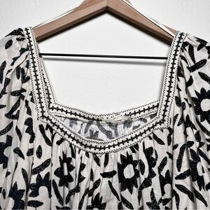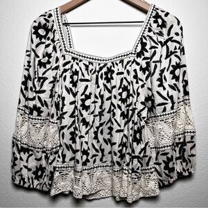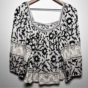 Christian Siriano Women Linen Top XL Cream Black Crochet Lace Cottage Boho Peasant Square Neck Floral Spring