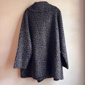 This Christian Siriano Women's Animal Print Wrap Cardigan Sweater in size 3X is a stylish and versatile piece suitable for various occasions such as travel, casual wear, work, and business meetings. Made from an acrylic blend with a grey black animal print pattern, this mid-length cardigan features long sleeves and a button closure. The relaxed fit and open accents add a trendy touch to this coatigan, perfect for the winter, fall, and spring seasons. Hand wash only to maintain its quality, this Christian Siriano cardigan is a must-have for any fashion-forward woman looking to make a statement with her outerwear.