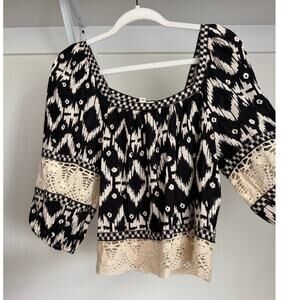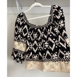 Elevate your wardrobe with this stunning Christian Siriano blouse! Featuring a unique Aztec pattern and delicate lace detailing, this blouse is perfect for adding a touch of bohemian chic to any outfit.