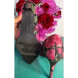 Step out in style with these vibrant floral heels by Christian Siriano. Designed for comfort and style, these pointed toe pumps feature a gorgeous pink rose print over a black background. Great for both everyday chic and special occasions.