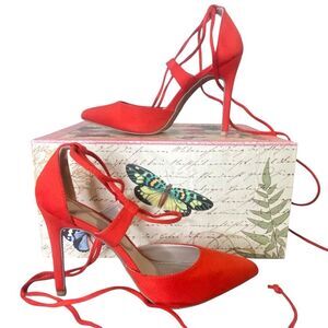 Sexy red Christian Siriano heels featuring a longer ankle strap that will wrap up the calf. The pointed toe and thin stiletto heel add elegance, making them perfect for formal occasions. Crafted from a soft, suede-like material, they exude luxury and style at an affordable price.