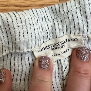 preowned. Elevate your wardrobe with this stunning Christian Siriano blazer. Crafted from 100% linen, this minimalist piece features a cream and black striped pattern, perfect for any casual, workwear, or business occasion. The long sleeves and regular size type make it a comfortable and versatile addition to any wardrobe. This blazer is perfect for women who want to look stylish and professional. The brand name alone speaks to the quality of this piece, and the material ensures durability and comfort. Add this blazer to your collection today and step out in style.