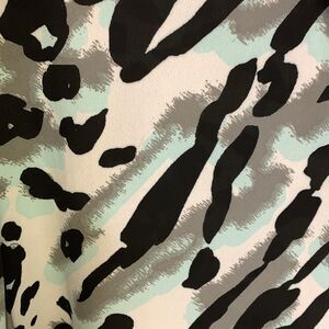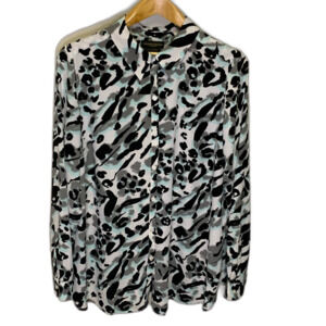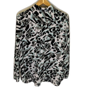 White, black and gray with a touch of light aqua blue leopard print give this silky button up blouse a unique style. Christian Siriano and Lane Bryant Collab. Beautiful! Collar and cuffs, long sleeves, easy care polyester.