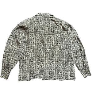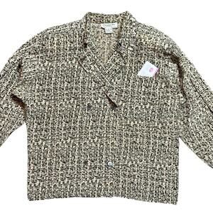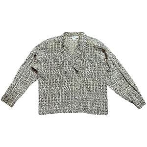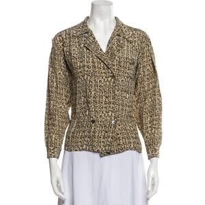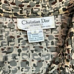 Beautifully structured blouse featuring an abstract geometric grid print in tan, olive, and charcoal tones. Lightly padded shoulders and button cuffs give it that elevated vintage Dior silhouette. Soft, lightweight drape with a slightly cropped fit. Excellent condition.