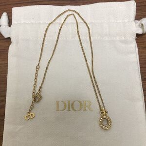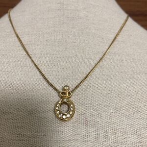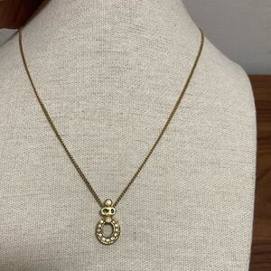 Christian Dior signed vintage oval pendant logo necklace embellished with clear crystals. Gold plated, polished finish, rhinestone embellished, cut out oval pendant, delicate chain, spring ring clasp with extender.
