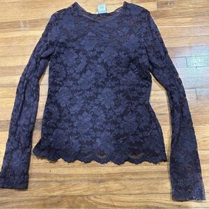 Christian Dior beautiful plum with black threading, stretch lace blouse, size medium, very upper sheer, and sleeves sheer, lined body, lots of stretch