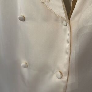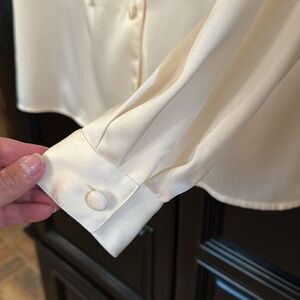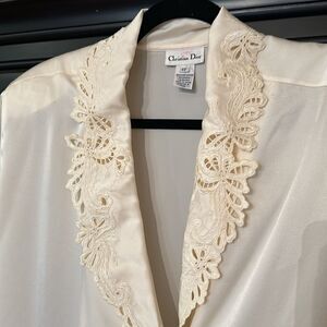 Gorgeous Christian Dior blouse. The shoulder pads are an indication that it’s from the 80s or 90s. It’s in beautiful shape. One interior button is missing. It could be easily replaced and it’s not visible when worn this is a size 12 100% polyester feels like silk.