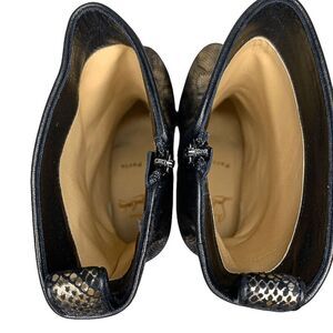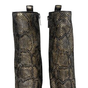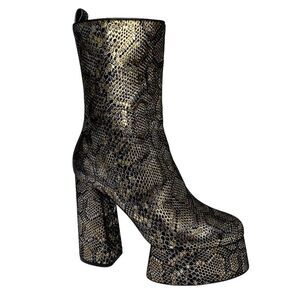 - Black suede with shimmering gold metallic detail in a snakeskin print