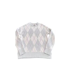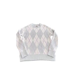 The sweater is in good condition with no visible signs of wear or tear, Style: Off-white, purple and pale gray argyle knit pullover sweater. Long sleeves and crew neckline. Ribbed bottom hem, sleeve cuffs and neckline. Slits on bottom sides. Soft material that offers stretch. Relaxed fit. the fabric is soft and comfortable. It is a versatile piece that can be dressed up or down.