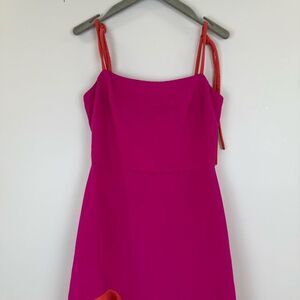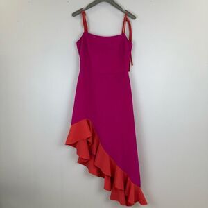 Pink and coral orange color blocked crepe (92% Polyester, 8% Polyurethane). Hourglass. Sleeveless. Square neckline. Back zipper with hook-and-eye closure. Partially lined. 48 " from shoulder to hemline. Long side, short side 33”.Made in the USA.