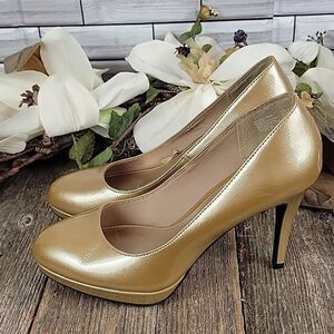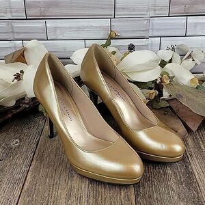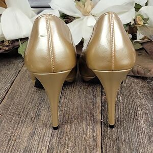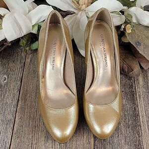 A shimmering gold 4" heel round toe pump by Christian Siriano. Good pre-owned condition showing slight signs of wear.