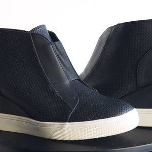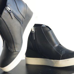 Lift casual looks with the Christie wedge sneaker from Mia. A vulcanized sole and elastic panel creates a sporty look perfect for joggers or jumpsuits. Pre-owned and pre-worn, in good condition, has minor scuff marks on sole. Features: