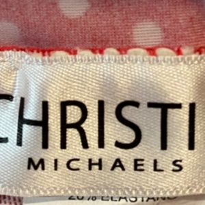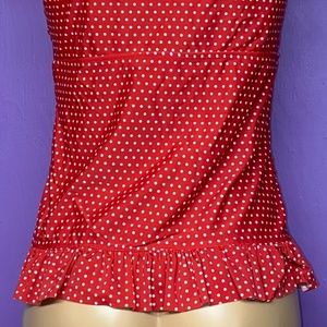 This is a pre-owned Christin Michaels women's tankini top in a size XL. This is in excellent condition. The measurement laying flat armpit to armpit is 17" and from the armpit to hem is 16". This is red with white dots, the straps are adjustable, the cups are lightly padded and can be removed and there is no underwire.