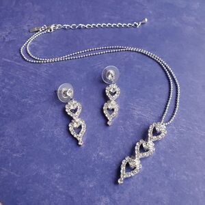 Christina Collection Necklace Earrings Set Silvertone Rhinestone Hearts Bling