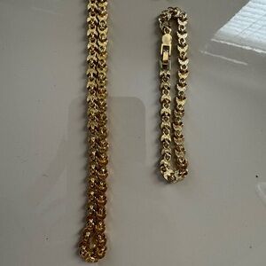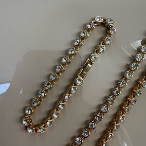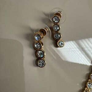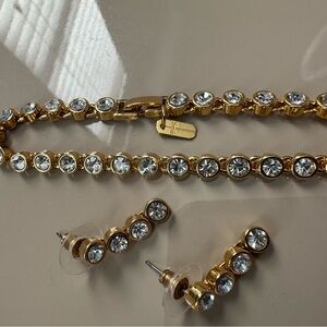 This Christina Collection is a stunning jewelry set that includes a necklace, bracelet, and earrings, all featuring sparkling rhinestones set in gold-tone metal. Perfect for any occasion, this collection will elevate your look effortlessly. In excellent pre-loved condition, with no signs of wear on metal.