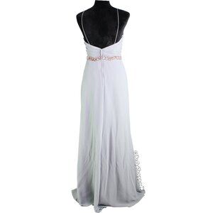 This is a brand new with tags Christina Wu Celebration Women's Platinum Gray Pleated Faux Wrap Chiffon Gown. This beautiful dress features a platinum grey chiffon fabric with a side slit, a rose gold rhinestone waist detail, pleated faux wrap bodice, spaghetti straps, hidden zipper on the back, and is full length. Perfect for any special occasion!