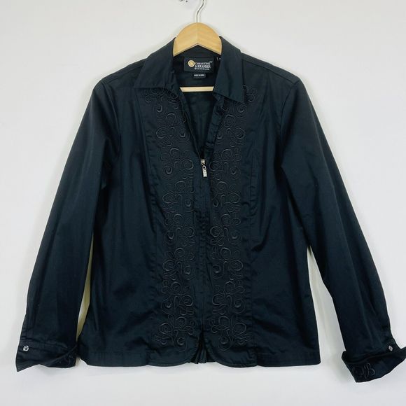 Christine Alexander Black Long Sleeve Embroidered Shirt Jacket. Lightweight cotton/spandex, shirt weight, but zips up the front like a jacket. Rhinestone accents on the zipper head and sleeve cuff buttons. Womens Medium.