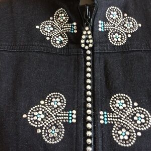 NWOT Christine Alexander beautiful black denim Swarovski crystal embellished jacket. Front and sleeves have the club shaped card symbol with silver beads, iridescent crystals and turquoise beads. There are Swarovski crystals imbedded along the zipper closure. Zipper pull with Swarovski crystals also. Approximate measurements laying flat: bust " across from armpit to armpit 20.5", sleeves 23", shoulders 15.5" across and length is 25".