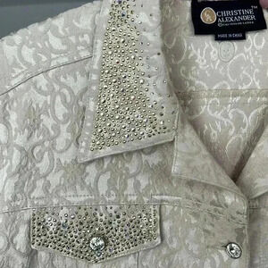 Cream/champagne colored Swarovski crystal jacket. 80%, polyester, 20% cotton. Brand new with tags, size medium. I would describe the medium for women’s sizes, not juniors. Probably between a size 8 and 10 women’s.