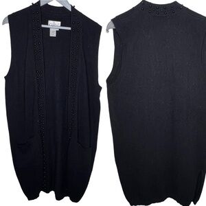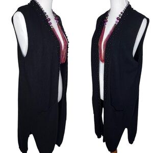 Vintage Christine Black Sleeveless Beaded Open Front Long Line Cardigan with Pockets Size L Lambswool Angora Blend