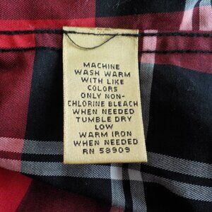 Plaid is red/white/black button down, collared, long sleeve.