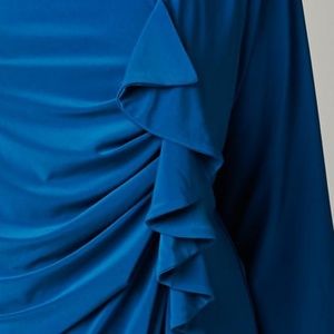 Quality Side Ruffle Dress with asymmetric neckline. 95% Polyester 5% Spandex Machine Wash Cold