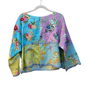 Christine Damen Blouse Womens XL Patchwork Floral Linen Boho Artsy Top