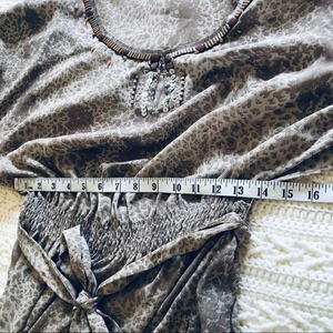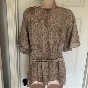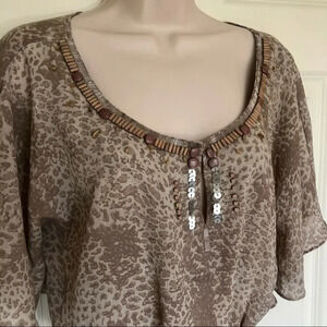 Christine Phillipe ivory, tan, grayish animal boho style print short sleeve blouse with brown wooden, pink and silver beaded neckline, wide arm, elastic waist and matching tie belt size small. In excellent used condition