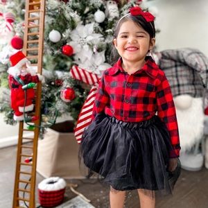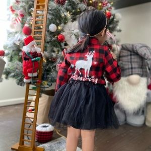 Reindeer & letter print red plaid long-sleeve shirt and mesh black tutu skirt